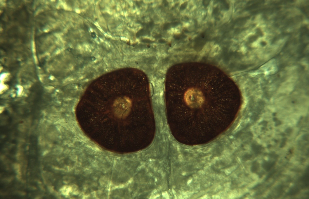 D–shaped closed, dark black coloured, stigmal plates with radially arranged respiratory holes (under 4x microscopy)