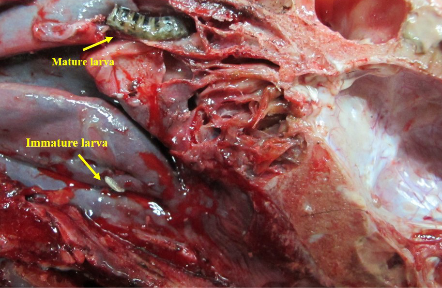 Larvae of O. ovis in the para nasal sinus of a buck (sagittal section)