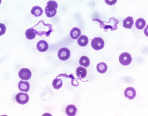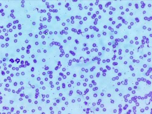 Thin smear of the culture on NNN media showing plenty of long, slender, flagellated, (15-34 μm) dividing forms of trypanosomes (Leishman stain, 1000X)