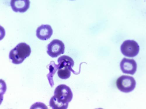 Thin PBS smear showing centrally located nucleus with a sub terminal kinetoplast at sharp posterior end and large undulating membrane with free flagellum (Leishman stain, 1000X)