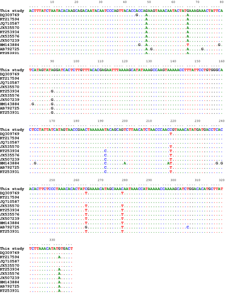 Alignment of the CO1 partial sequences (338bp) of our isolates with a number of T. multiceps isolates from variable host species within different geographical regions including sheep (DQ309769, KT217594, JQ710587, JX535570), goats (KT253934, JX535576, JX507239), cattle (HM143884) and dogs (AB792725, KT253931)