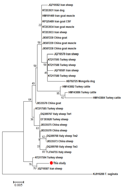 Neighbor-Joining phylogenetic tree of T. multiceps ND1 partial sequences from different hosts and geographical regions. T. saginata was used as an out group. Sequences were aligned by Bioedit and the tree was built using the software MEGA (version 6) with the Kimura 2 parameter mode. Scale bar indicates the proportion of sites changing along each branch