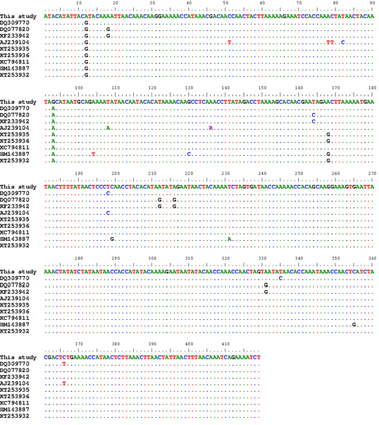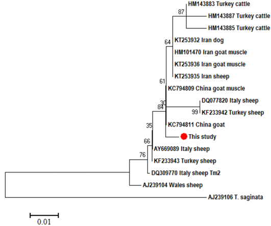 Alignment of the ND1 partial sequences (419bp) of our isolates with a number of T. multiceps isolates from variable host species within different geographical regions including sheep (DQ309770, DQ077820, KF233942, AJ239104, KT253935), goats (KT253936, KC794811), cattle (HM143887) and dogs (KT253932)
