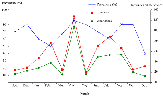 Monthly Gasterophilus infestation prevalence, intensity and abundance in donkeys from Tunisia