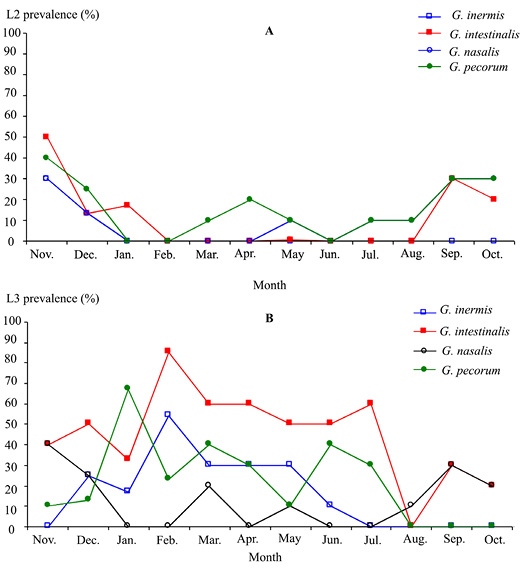 Monthly infestation prevalence by Gasterophilus larvae 2 (A) and 3 (B) instars in donkeys from Tunisia