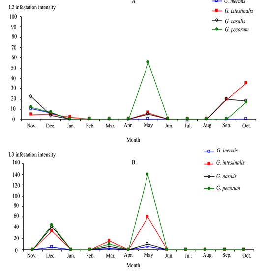 Monthly infestation intensity by Gasterophilus larvae 2 (A) and 3 (B) instars in donkeys from Tunisia