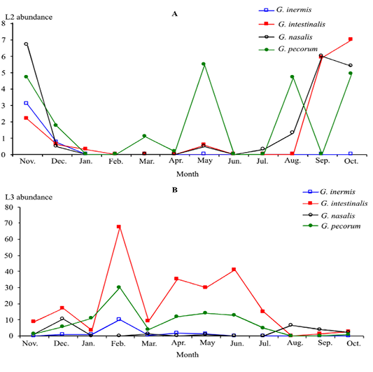 Monthly abundance of Gasterophilus larvae 2 (A) and 3 (B) instars in donkeys from Tunisia