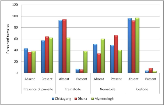 Prevalence on the basis of type of parasite (Trematodes, Nematodes and Cestodes) stratified by study areas.